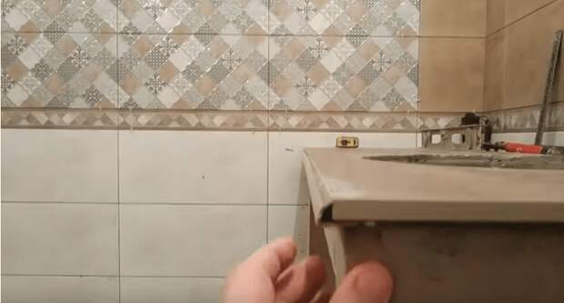 Вот и все, теперь осталось только вставить раковину, обработать место ее соединения со плиткой герметиком, а также приклеить уголки на края столешницы. Готово!