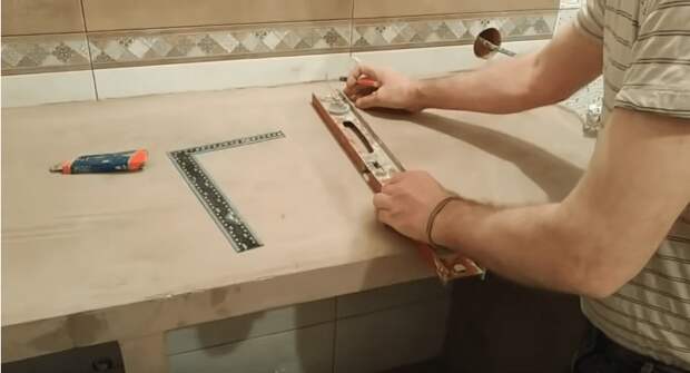 Первым делом необходимо выполнить замеры для будущей столешницы и нанести разметку на стену: вычисляем высоту, ширину и глубину, в зависимости от размеров раковины и того, что вы хотите разместить под столешницей, например, стиральной машины.