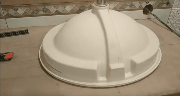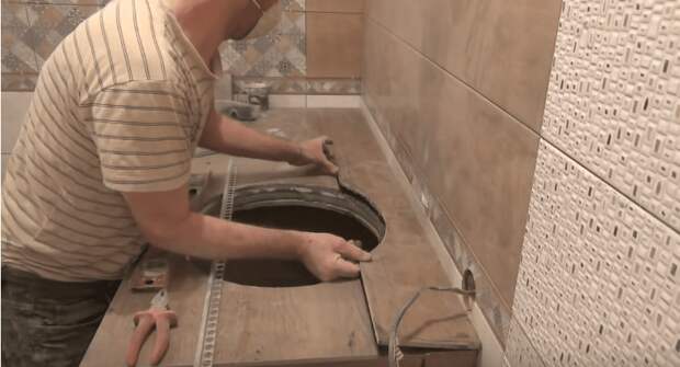 Затем можно вырезать отверстие под раковину. Для этого прикладываем раковину к столешнице и обводим по контуру, не забывая сделать небольшой отступ от края по толщине плитки, чтобы раковина приподнималась над ней. Далее вырезаем в столешнице отверстие для раковины, но пока ее не монтируем.