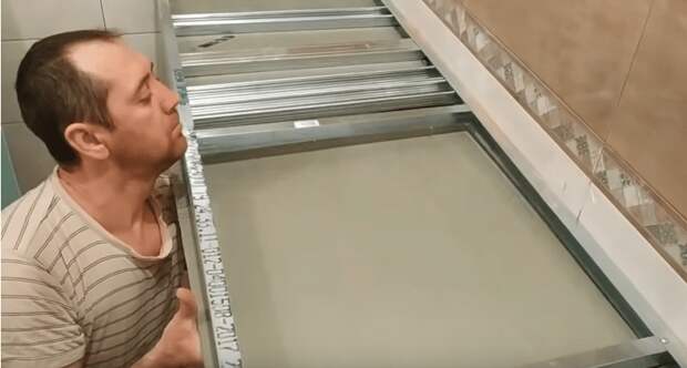 При замерах не забывайте учитывать также и параметры материалов: профиля, гипсокартона, плитки.Затем из металлопрофиля собираем каркас требуемого размера. Другой вариант — собрать каркас из ламинированной фанеры. В этом случае выставляем листы фанеры по разметке и скрепляем их при помощи металлических уголков.