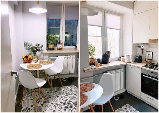 Поскольку помещение кухни совсем уж крошечное молодые люди экспериментировать не стали, они отдали предпочтение минимализму и скандинавскому стилю. Бело-серые тона разбавила контрастная напольная плитка в стиле печворк, которая очень оригинально смотрится, если правильно ее скомпоновать и не сильно увлекаться. На этом разнообразие было остановлено, чтобы не устраивать фейерверк цветовой гаммы.