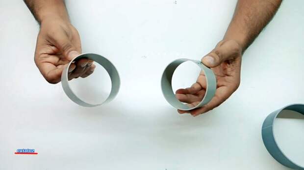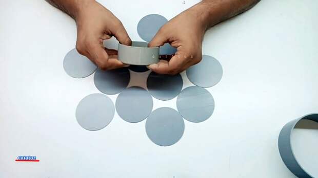 Из большой трубы отрезаем кольцо шириной 38 мм для основания люстры. После этого из трубки 60 мм нарезаем 12 колечек шириной по 28 мм. Важно чтобы срезы были ровными.