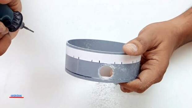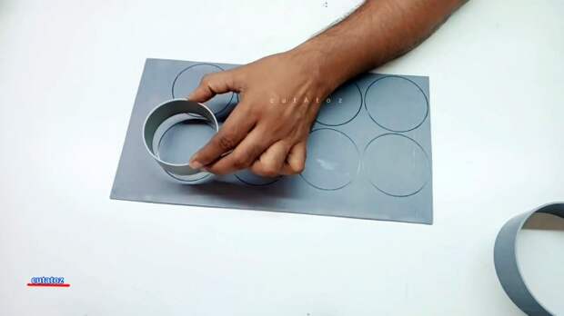Клеим полоску на большое кольцо, затем обрисовываем на нем окружность за 5 мм от края. По меткам рисуем круги, прикладывая короткий отрезок трубки 19 мм. Также по ней нужно обвести по одной кружку на малых кольцах.