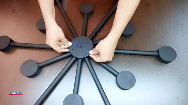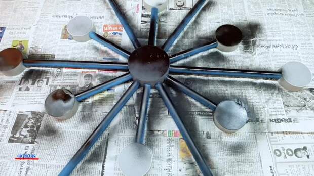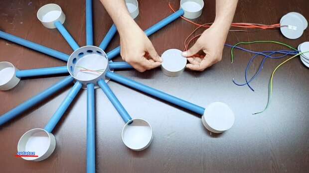 Провода пропускаются через лучи в центр люстры. Заглушки можно не вклеивать, а просто поставить, если они входят плотно. Это сделает люстру более ремонтопригодной. Пучки проводов в центре скручиваются, и выводятся через заглушку.
