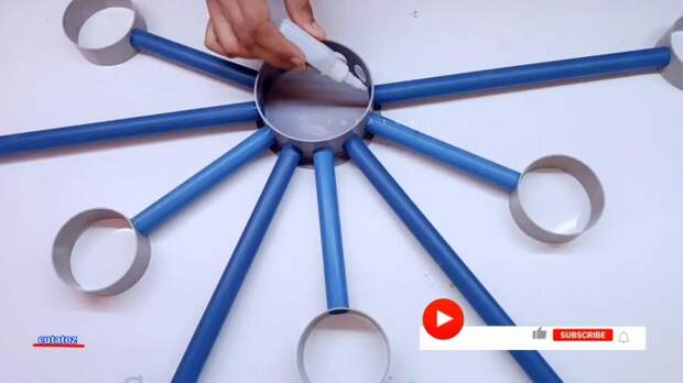 Теперь нужно вклеить лучи, чередуя их по длине. Важно, чтобы рассеиватели находились со стороны вклеенной накладки на центральном основании люстры.