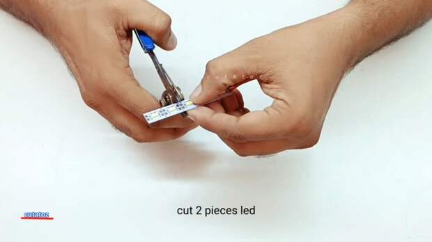 Далее берем светодиодную ленту, и нарезаем ее на кусочки. К ним припаиваются провода. Затем ленты приклеиваются на заглушки.