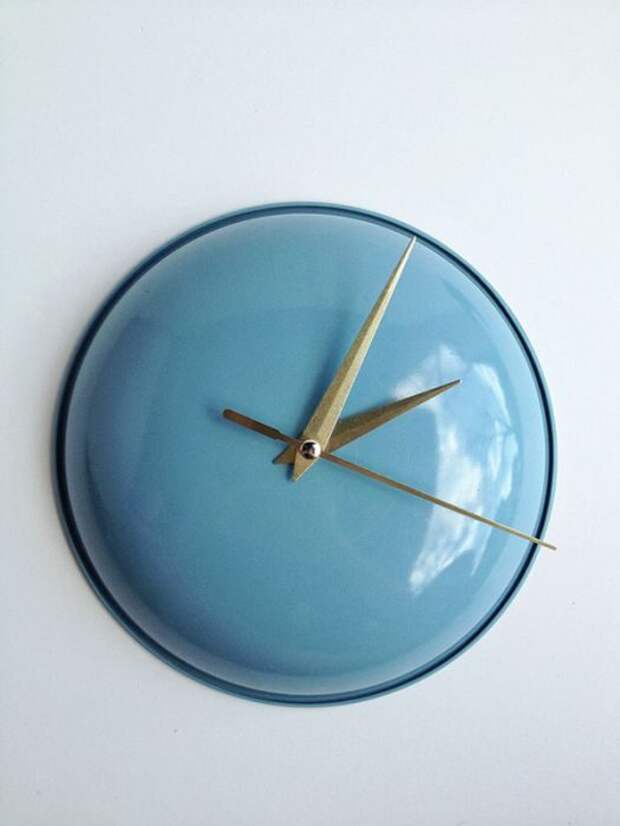 Удалив ручку от крышки и поместив вместо нее механизм часов, можно получить оригинальные настенные часы.
