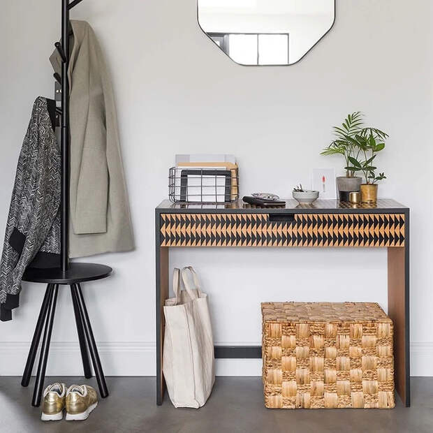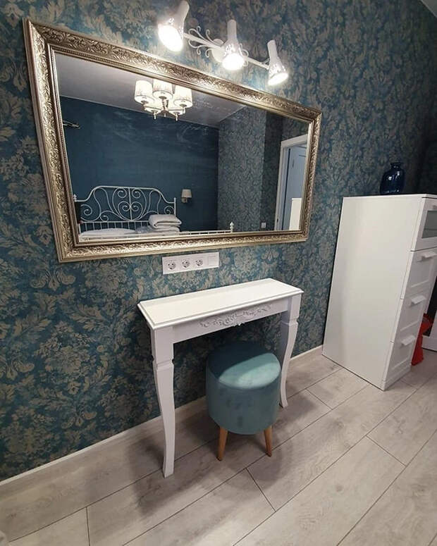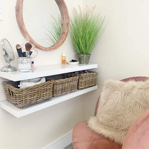 Поскольку к такому столику нельзя прикрепить зеркало, его можно повесить на стену над ним. Если полка простая, ставить на неё зеркало нежелательно, поскольку максимальный вес, который она сможет выдержать, — до 5 кг.