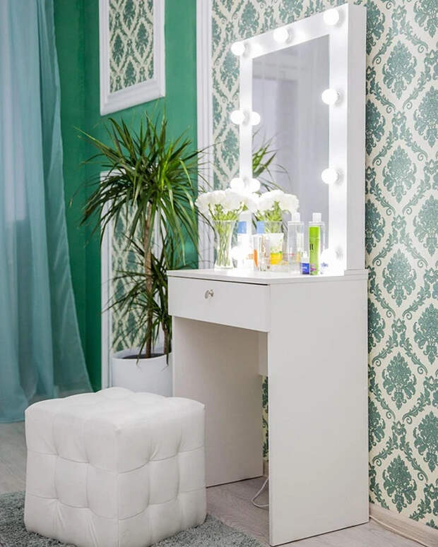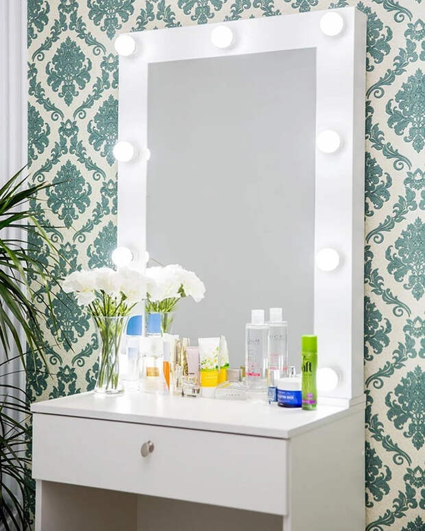 Самая сложная модель туалетного столика своими руками — с зеркалом и подсветкой. Можно схитрить и дополнить этими аксессуарами уже имеющийся стол.