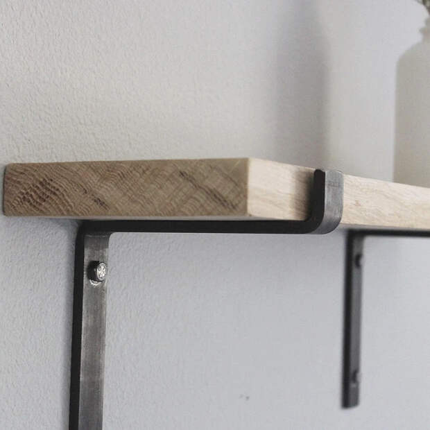 - Кронштейны — 2 или 4 штуки в зависимости от количества полок. Подойдут как деревянные, так и металлические, как на фото ниже.