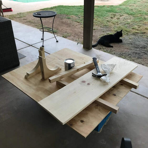 Можно переходить к подготовке основания. Его сборка зависит от конструкции. Её можно упростить, например, заменив тонкие фигурные ножки на широкие деревянные панели, которые крепятся к торцу.