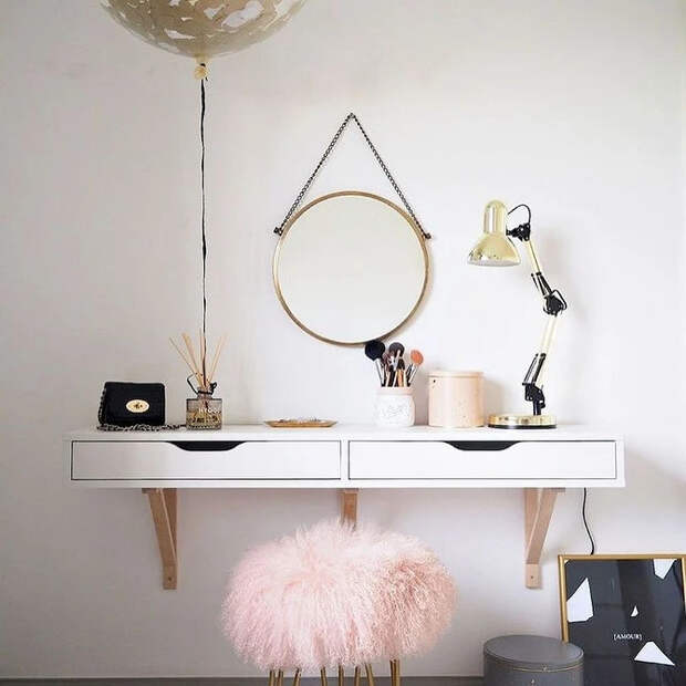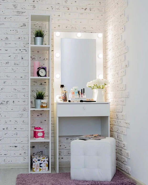 Даем пошаговые инструкции по сборке туалетного столика из полки, с подсветкой, консольной конструкции и классического варианта на четырех ножках.