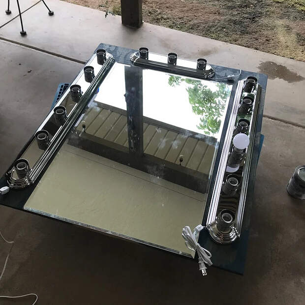 Проще всего сделать квадратную раму для зеркала. Во-первых, это быстрее, а во-вторых, проделывать отверстия под лампы в ровной раме легче, чем в фигурной. Да и с точки зрения стиля модель без обилия деталей выглядит лучше.