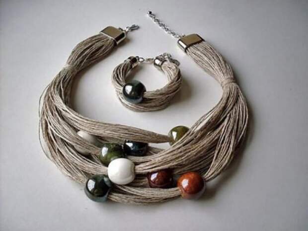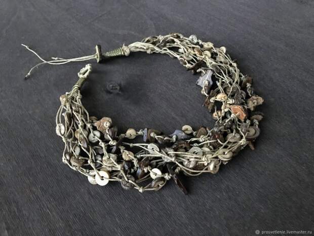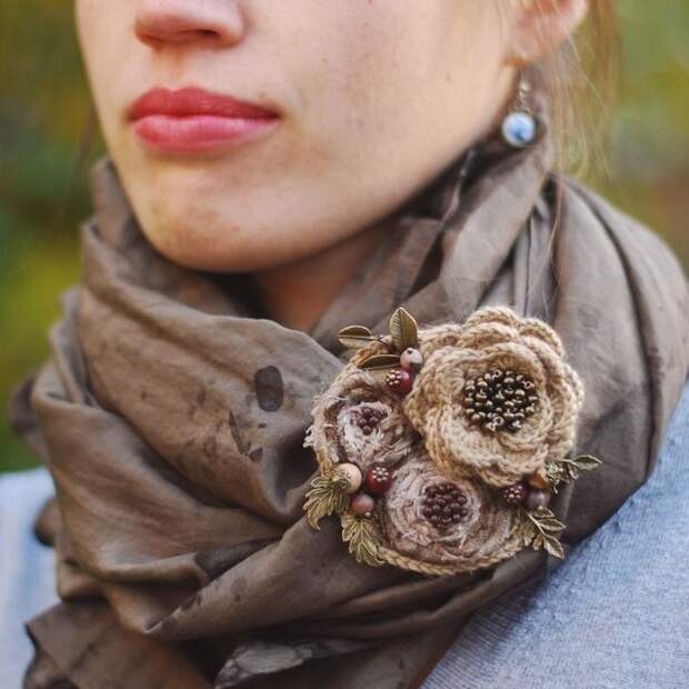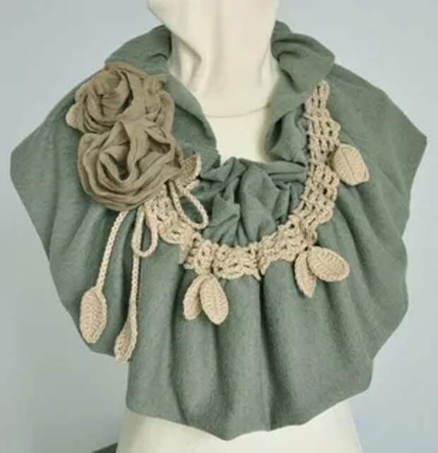 Такой аксессуар можно изготовить самостоятельно из природных материалов. Красиво смотрятся шарфы связанные своими урками с добавлением небольшой фурнитуры или бусин. Здесь же можно использовать льняные нитки или небольшие шнуры из природного материала. Работая в технике макраме или просто свободно сплетая нити, можно создать неповторимое украшение.