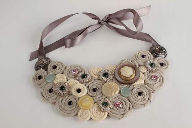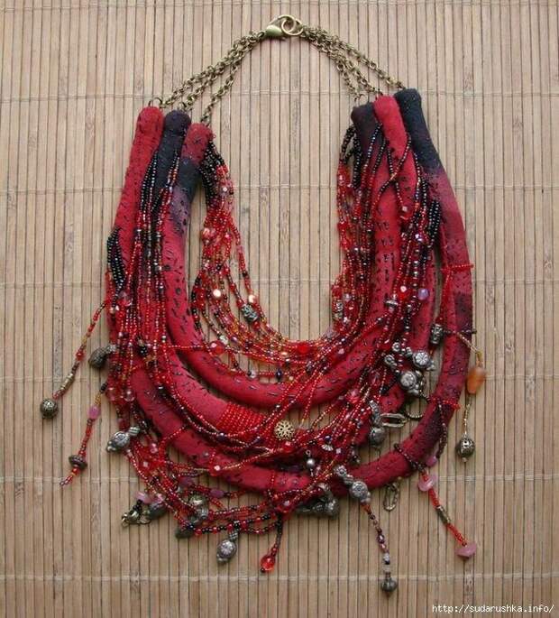 Для начала создается модель-выкройка, на основании которой можно заранее предположить как будет выглядеть готовое изделие. Металлическая фурнитура будет подчеркивать ткань, которая и будет в основе изделия. Кусочки ткани можно скручивать или оборачивать ими металлические части, добавляя ко всей конструкции бусины, сочетающиеся по материалам или цветовой расцветке.3. Шарфы из ткани или шнуров